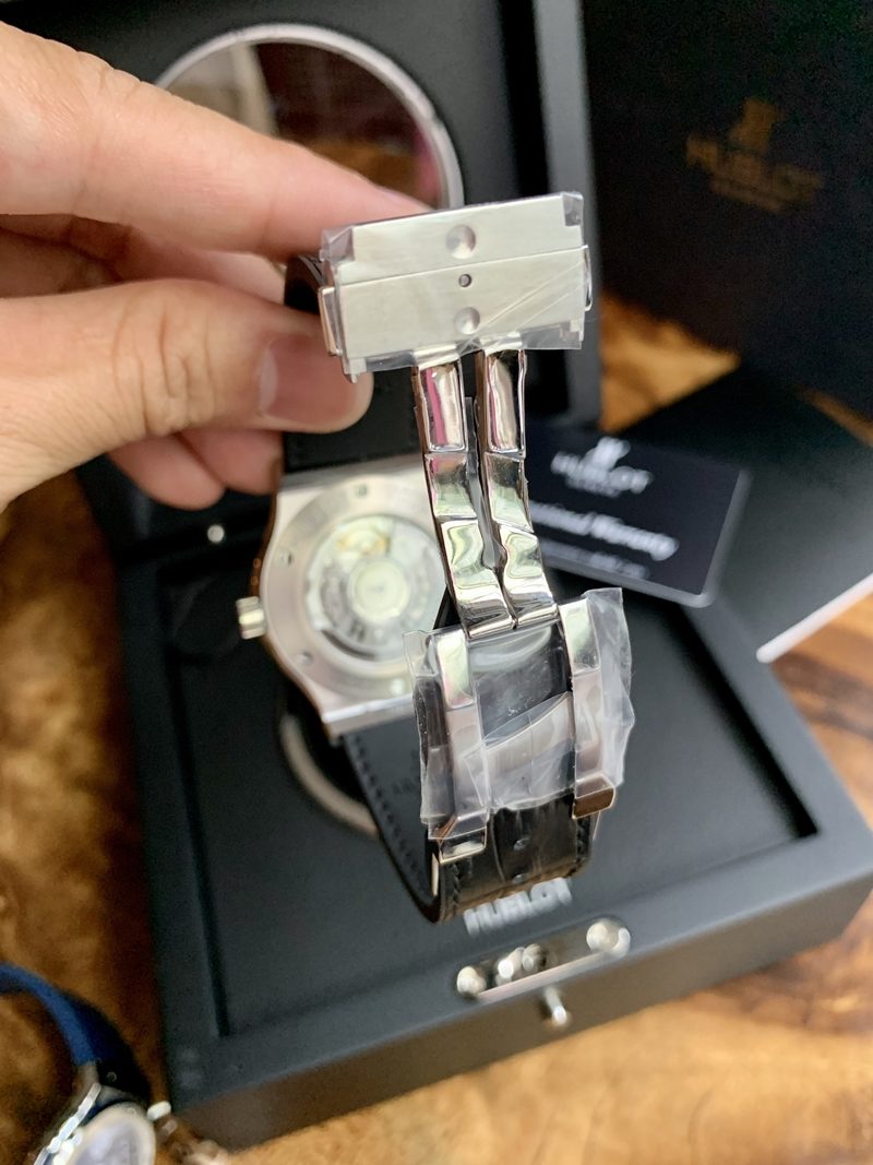 Hublot Replica super Fake hàng chuẩn 1:1 đối với bản thép độ hoàn thiện gần như cao nhất thép cao cấp, máy Hublot 1112 ( eta 2892 ) tương đồng với bản gốc của Hublot, dây da bò dập vân cá sấu, cao su dẽo mền. Nếu để đeo giống nhất theo shop bản thép hay ceramic là chuẩn nhất. Thứ nhất về giá bản thép tầm 5500$ độ hoàn thiện thép. Còn bản mạ vàng mạ bằng công nghệ PVD màu bền 2-3 năm sử dụng sẽ mòn màu tùy vị trí nào hay cọ sát, bản gốc của hublot là đúc vàng khối, Đồng Hồ HUBLOT FUSION replica mặt trắng